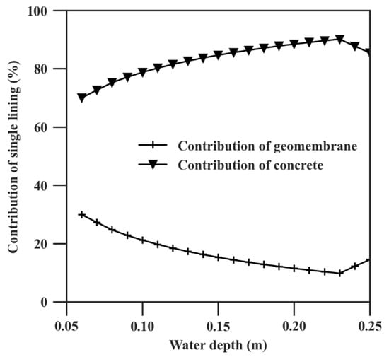 where Cg is the contribution of geomembrane to the reduction in seepage; Cc is the contribution of concrete to the reduction in seepage; ΔSg is the seepage reduced by the geomembrane lining alone (m3/(m·h); and ΔSc is the seepage reduced by the concrete lining alone (m3/(m·h)).