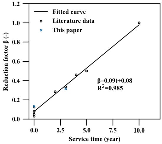 A linear fitting line was used to quantify the relationship between the reduction factor of the combination of concrete and geomembrane lining and its service time; see Equation (19):