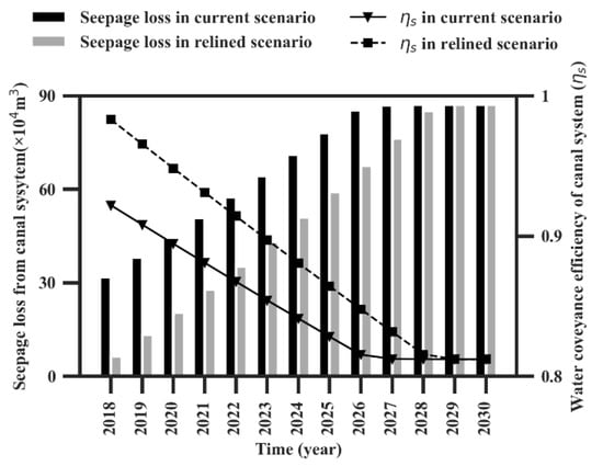Estimation of seepage loss from canals and water conveyance efficiencies of the canal system (ηs) in the reline scenario and current scenario in 2018–2030.