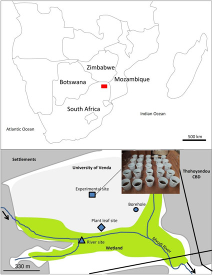 The study was conducted at the Department of Ecology and Resource Management, University of Venda, Limpopo province of South Africa (Figure 1). The area has a humid, subtropical climate and receives an average annual rainfall range of between 400 and 800 mm, with peak rainfall occurring between January and February. High temperatures (i.e., up to 40 °C) occur between October and March, with the cool-dry season temperatures ranging between 12 and 22 °C. The area soil type is loam which is red in color due to the presence of iron oxide. This iron oxide in the soil is a result of iron containing ultra-mafic and mafic parent rock, which was formed through physical and chemical weathering. Plant leaves were collected from a riparian zone of the wetland within the university campus perimeter, whereas borehole and river water were collected from a student resident construction borehole and a relatively pristine river site located in the wetland, respectively (Figure 1).