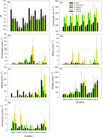 Nutrient release concentrations (i.e., amount present in waterbody) (+standard deviation) of invasive Lantana camara (yellow) and Psidium guajava (red), and native Terminalia sericea (blue) and Ficus sycomorus (green), over a 6-week period: (a) pH, (b) conductivity, (c) phosphates, (d) nitrite, (e) nitrate, (f) silicate, and (g) ammonium.