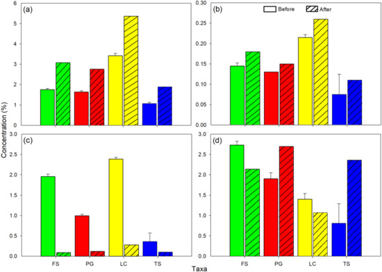 The leaf total N and P concentrations were higher at the end of the experiment for all leaf treatments, with highest and lowest concentrations being observed in invasive L. camara and indigenous T. sericea, respectively (Figure 3a,b). Invasive P. guajava and indigenous F. sycomorus had similar concentrations before and after the experiment. For K, the concentrations were high before the experiment, after which the concentrations significantly reduced at the end of the experiment; however, concentrations in T. sericea were relatively low (Figure 3c). Effects on Ca were generally different among species, with reductions over time shown in F. sycomorus and L. camara, and increases for P. guajava and T. sericea (Figure 3d).