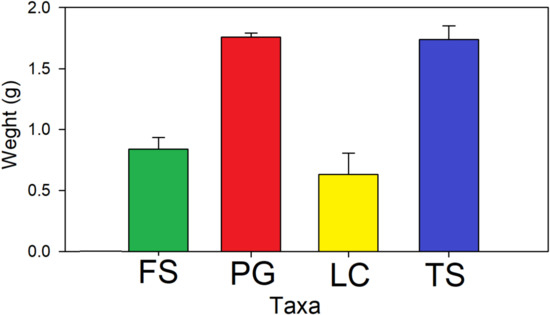 Mean values (+standard deviation) of end-weights of invasive L. camara (LC; yellow) and P. guajava (PG; red) and native F. sycomorus (FS; green) and T. sericea (TS; blue). Initial weights for all species were 3.0 g of dried leaf material.