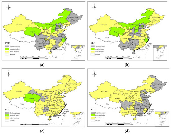 | Index increased | Henan, Chongqing, Shandong, Hunan, Shaanxi, Guangxi, Ningxia, Gansu, Fujian, Liaoning, Hainan, Xinjiang | Anhui, Guangdong, Sichuan, Hubei, Jilin, Ningxia, Jiangsu, Jiangxi, Fujian, Shandong, Liaoning, Gansu, Heilongjiang, Xinjiang | Anhui, Hainan, Hubei, Hebei, Shanghai, Beijing, Jiangxi, Xinjiang, Jilin, Guangdong, Yunnan, Liaoning, Ningxia, Shaanxi, Fujian, Henan, Shandong, Guangxi, Sichuan, Hunan, Jiangsu, Chongqing, Inner Mongolia, Shanxi, Zhejiang, Heilongjiang | Qinghai, Guizhou, Henan, Chongqing, Shaanxi, Beijing, Yunnan, Shanghai, Guangxi, Xinjiang, Tianjin, Inner Mongolia, Hainan, Ningxia, Fujian, Liaoning, Shanxi, Gansu |