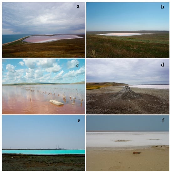 The Crimean studied lakes: (a) Lake Koyashskoe; (b) Lake Kirkoyashskoe; (c) Lake Chokrakskoe; (d) Mud volcano on the dried bottom of Lake Tobechikskoe; (e) Lake Krasnoe; (f) Lake Uzunlarskoe.