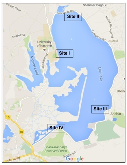 Dal Lake—known as the ‘Jewel of Kashmir’ is one of the most attractive tourist destinations in the world. The lake is surrounded by mountains on its three sides, Zabarwan in the east, Kohimaraan in the west, and Shankacharya in the south and is adjoined by beautiful Mughal gardens [1]. It is well known for its tourism and economic potential, as a multi-basin lake, covering an area of 16.6 km2 and with a water holding capacity of 15.45 × 106 m3 [2]. Dal Lake has evolved as eutrophic in nature because of the discharge of organic rich effluents, sewage, sediments, and other nutrients from the surroundings and the floating gardens established within it. Several anthropogenic activities and ecological stress have forced the lake to shrink like other cases of the world, such as the Aral Sea [3] and the Dead Sea [4], in terms of its surface area, water quality as well as the nature of biodiversity [5]. The beauty of Dal Lake (Figure S1 in the Supplementary Materials) has been described and appreciated for centuries. Walter Roper Lawrence, as Resettlement Commissioner of Srinagar in 1887, wrote about the Dal Lake: “Perhaps in the whole world there is no corner as pleasant as Dal Lake”. Praising the water of Dal Lake, he mentioned “The water of the Dal is clear and soft as silk, and the people say that the shawls of Kashmir owe much of their excellence to being washed in the soft waters of the lake” [6].