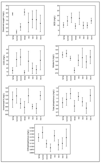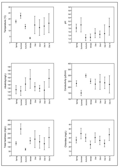 Evaluation of physicochemical factors is basic to the understanding of the trophic status of the concerned water body. These deduced characteristics of the lake water analyzed in different seasons at different sites 2016–2017 are presented as whisker and mean plots with standard deviations in Figure 2. In present study, most of the physicochemical parameters showed a high standard deviation, which is an indication of spatiotemporal variations expectedly caused due to anthropogenic activities and climatic aspects. Water temperature, a characteristic seasonal feature, ranged from a minimum of 3 °C in winter at Site I to a maximum of 25.5 °C in summer at Site IV. pH recorded during the course of study was in alkaline range and ranged from 7.0 at Site III during autumn to 8.5 in summer at Site IV, suggesting the lake as well buffered and productive in nature [21]. Total alkalinity ranged from 110 mg/L at Site III during spring to 190 mg/L at Site IV during winter. The alkaline nature of the lake may be attributed to photosynthetic activity of primary producers [5,21]. Electrical conductivity was found to be maximum in autumn at Site IV and minimum during summer at Site II. The higher conductivity during autumn may be attributed to a higher rate of decomposition and decreasing water levels in the lake. The low values in summer may be due to higher rates of assimilation by lake biota [22]. The catchment areas of lake are rich in limestone and dolomites, the wealthy sources of calcium and magnesium ions [23]. Total hardness was maximum 378.6 mg/L at Site IV during summer and minimum 60 mg/L at Site III during autumn. Maximum water flow, precipitation of calcium carbonate, and photosynthetic activity of primary producers may be the other reasons for higher hardness during summer. Chloride concentration was minimum 18.3 mg/L at Site III during winter and maximum 43 mg/L at Site IV during summer. Higher chloride values at Sites I and IV are indicating higher anthropogenic pressures in these areas [24]. DO and water temperature are negatively related because warm water can hold less DO than cold water as the solubility of oxygen decreases with increase in temperature [25]. DO was minimum 5.1 mg/L at Site I during summer and maximum 8.5 mg/L at Site III during winter. Maximum BOD and COD were recorded at Site I and IV during autumn and minimum at Site II in winter. Sites I and IV have higher BOD and COD, which is in accordance with previous studies and is attributed to higher loads of agricultural runoff and domestic wastewater [26]. Higher proportions of ammoniacal nitrogen, nitrate nitrogen, total phosphorous, and orthophosphorous were observed during summer and low during winter, which may be attributed to the increased pollution loads and agricultural runoff during summer [26,27].