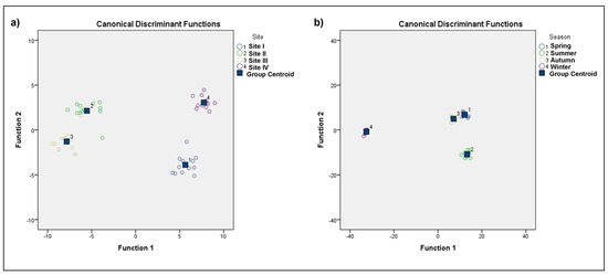 Canonical discriminant plot showing (a) spatial variation and (b) temporal variation of physicochemical parameters of Dal Lake water.