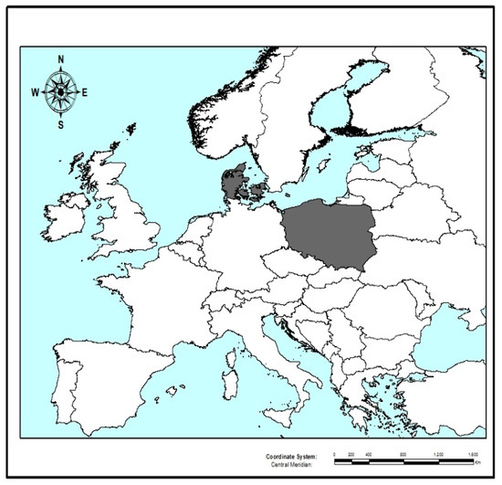 Map of Europe highlighting Poland and Denmark (ArcGIS® Esri, 2016).