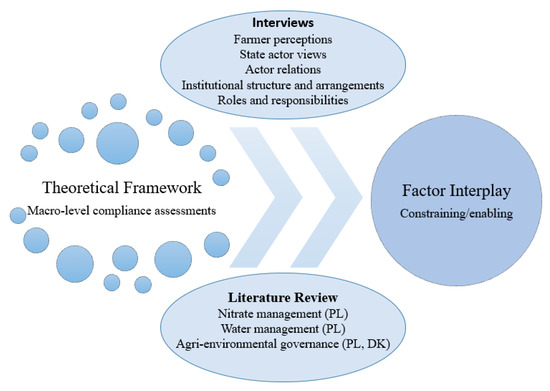 Themes central to assessing effective governance of the WFD, identified by Wiering et al. [12], include (1) integration and fragmentation, (2) source-and-effect-based measures and (3) intricacies of knowledge production. A number of studies explore MS implementation performance of the WFD in light of these themes to better understand the conditions and processes that give rise to particular compliance outcomes [5,11,25,26]. Empirical investigations of management discourses within local landscapes can demonstrate implementation performance as a social practice and provide compelling case studies to understand the conditions that lead to a particular compliance outcome [27,28,29,30]. The point of departure of the study is to identify influencing factors that shape the nitrate management discourse situated at the intersection with the WFD and the Common Agricultural Policy (CAP) in Poland. The study identifies underlying influencing factors that contribute to shaping particular outcomes of the aforementioned themes central to governance of the WFD. The study focuses on theme 1 in understanding how an interplay of factors contributes to governance structures and ensuing social arrangements determining actor roles and responsibilities. In addition, a comparison of governance capacity between Poland and Denmark is made to calibrate implementation performance and discern wider lessons in relation to the WFD governance themes.