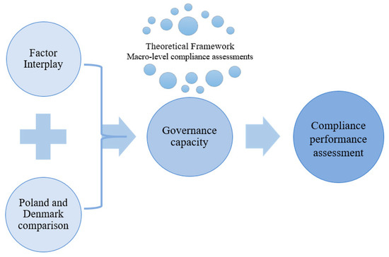 The analytical framework focuses on how the two components relate to one another to comprise the evaluation study. The flow-chart Figure 3 and Figure 4 demonstrate the main elements and sequence of the two phases of the analytical approach. The figures provide a sequential visual of how the theoretical framework links to the separate components and how taken collectively, the analysis influences the interpretation of the results and thereby structures the discussion. The figures focus on the following: (1) factor interplay analysis (2) deducing governance capacity elements from the Poland and Denmark comparison. Together, the components comprise the framework for compliance performance assessment.