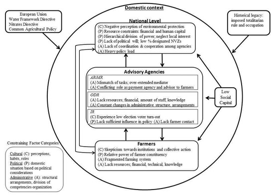 The implementation of EU agri-environmental measures has been particularly problematic for the Polish state as there is a “misfit” between EU requirements and the governance capacity of the state to fulfill objectives set forth by the Nitrates and Water Framework Directives. There are various constraining and enabling factors, which inform the discourse of nitrate management and are identified in the following section. A synthesized table and a figure of the interplay are included at the end of the analysis.