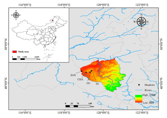 The plant investigation was conducted during July 2018. The meadows with four different fenced years (SAN: Light grazing; CHA: fenced for three years; GU: fenced for seven years; TE: fenced for ten years) within the Hulunbuir grassland were used as the investigation objects (Figure 1). Five or more 100 m sample lines are set in parallel in the meadows, and their distance of interval is 50 m. For each sample line, surveys were conducted every 25 m from one end to the other, and a total of 5 times surveys were performed for each sample line. The plot survey uses the grass-square method: Use a 1 × 1 meter’s square tool. First tile it on the ground; then count the numbers of various plants in it in turn and cut them off the ground. Up collecting plant statistics, the litter in the square tool is collected, with the litter mass is obtained after air-drying. The mowed plants were killed for one hour in an oven at 105 °C, and then dried in a dryer at 80 °C for 24 h to obtain biomass.