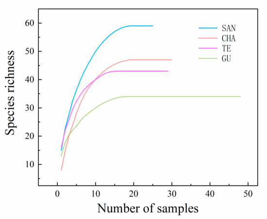 We draw a sparse curve to represent the trend of species richness as the number of samples increases (Figure 2). The results show that the number of samples in the plots SAN, CHA and TE ranges from 25 to 30; Because the plot GU has a larger area than the other three plots. Therefore, in order to better describe the community composition of GU, we conducted a survey of 50 samples. The species richness of each plot varied from 30 to 60, of which the species richness of SAN (light grazing) was the highest, and the species richness of GU (fenced for seven years) was the lowest. The species richness of the four meadows eventually stabilized with the increase in the number of samples, indicating that the sampling depth of each plot was reasonable.