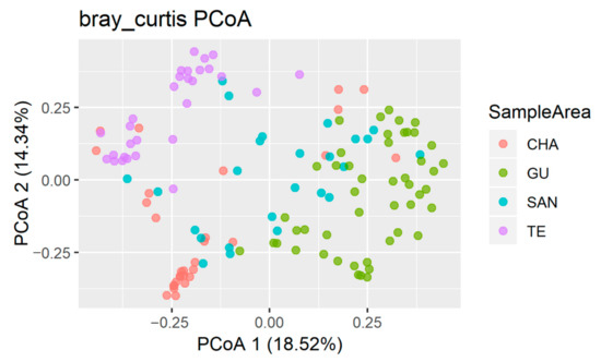 It can be seen from Table 1 that the diversity and evenness of various plots have distinctive differences. Compared with fence plots, plot SAN with light grazing have higher diversity and evenness. The diversity of GU and TE of the plots with longer time of fencing is more consistent, and is significantly higher than that of the plot CHA with a three-year fence. Among them, the plot TE with the longest time of fencing show the lowest evenness and community composition is relatively solitary. From the Principal Co-ordinates Analysis (Figure 3), it can be seen that the point distribution of the four meadows is relatively scattered, with the PERMANOVA results showing that P < 0.01. The diversity among the plots is significant, with the plant species greatly differing between meadows with different time of fencing.