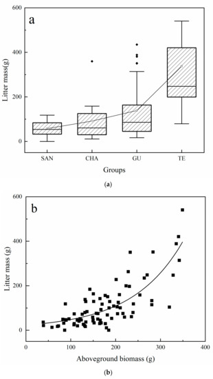 The average litter accumulation across the four meadows vary depending on factors such as plant species and time of fencing. From Figure 4a it can be seen that the TE litter mass fenced for ten years is the highest, with an average value of 320 g/m2. The litter mass measurements in each meadow were all different. The lowest value was only 80 g/m2 and the highest was 505 g/m2. The litter accumulation of SAN (light grazing) was the lowest, with an average of only 40 g/m2. Moreover, the litter accumulation difference in the sample plot SAN was also the smallest, with a minimum value of 0 g/m2. After fitting the litter mass of all the litter samples in four meadows to their biomass (Figure 4b, the outliers had been excluded), it can be found that the two showed an exponential correlation: , and P < 0.01. The litter mass increased with the aboveground biomass, and its increase rate gradually increased. This result is similar to the change of litter accumulation in meadows of different years of fencing (Figure 4a).