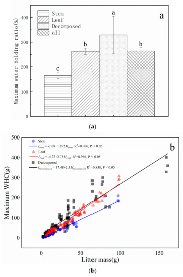 (a) The water-holding ratio of stem, leaf and decomposed parts of litter. (b) Linear fitting of the mass of stem, leaf and decomposed with its water-holding capacity (WHC) in all samples.