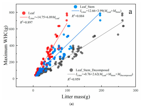 For the three parts of litter (stem, leaf and decomposed part) from four different pastures, their mass and WHC were linearly fitted. For the three fitting results obtained, the residuals of their dependent variables all conform to the normal distribution, and P < 0.05. As showed in the Figure 5b, even if the time of fencing, plant species, and litter accumulation of each meadow are different, the fitting results of the litter’s three parts reflect a positive correlation linear relationship. The R2 of stem, leaf and decomposed parts were 0.966, 0.966, and 0.838. This indicated that the WHC of each part of the litter is highly (and not only) related to its own mass.