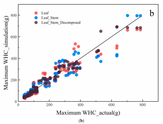 The results can be seen in Figure 6a, the R2 from the three models are 0.897, 0.884, and 0.959, all demonstrated high levels of accuracy. Among them, the model (Equation (6)) using the leaf, stem and decomposed part mass as the independent variable is the most accurate. It can be seen from the comparison of the theoretical and actual values of the WHC of the three models (Figure 6b) that there is no significant difference between the three, and they can all be put into production practice.