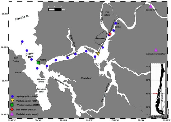 The VRE is located close to Valdivia city (39°49′22′′ S, 73°15′0.0′′ W) in south-central Chile (Figure 1). The VRE is governed by a gravitational circulation and hosts a very productive marine ecosystem. A large number of economic and recreational activities related to artisanal fisheries, aquaculture, transport, and tourism have developed in and around this estuary. Nevertheless, this estuarine system is still less exploited than the estuaries of central Chile [15] and the fjords of Chilean Patagonia, which in recent years were targeted by commercial projects to develop hydroelectricity, tourism, and aquaculture [16]. The VRE includes Corral Bay at its mouth, and inland the San Juan Inlet, which is separated from the former bay by the Mancera Island, and the rivers Valdivia and Tornagaleones. The Valdivia River is fed by the rivers Calle-Calle from the east and Cruces and Cutipay from the north, hosting one of the most important wetland systems of Chile [17]. The Valdivia river flows into Corral Bay, after traveling just 15 km where the VRE reaches its maximum depths (~25 m) [18]. The Tornagaleones River enters Corral Bay from the southeast of Mancera Island. The flow of the Calle-Calle and Cruces Rivers is in synchrony and both represent the most important components of the VRE. The sum of their annual average discharge is ~670 m3 s−1 being maximal in austral winter (~1500 m3 s−1 in July) and minimal in austral summer (~210 m3 s−1 in March) [13,19]. Tides exhibit semi-diurnal phases in Corral Bay with a mean tidal height range of 0.8 m but vary from 1.48 m during spring tides to 0.53 m during neap tides [20]. Thus, the estuary is classified as microtidal.