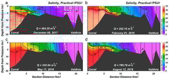 Mean salinity (ebb and flood tides) along the central axis of the VRE during spring tides for different seasons of the year. (a) Austral spring, 6 December 2017. (b) Austral summer, 1 February 2018. (c) Austral fall, 17 May 2018 and (d) Austral winter, 12 August 2018. The vertical gray lines in each panel mark the positions where the CTD profiles were taken. The black contour lines are isohalines in intervals of 5 PSU. The 1 PSU isohaline (white contour) was employed to determine the extent of saltwater intrusion; Q is the sum of the average flows of the Calle-Calle and Cruces rivers 7 days prior to sampling.