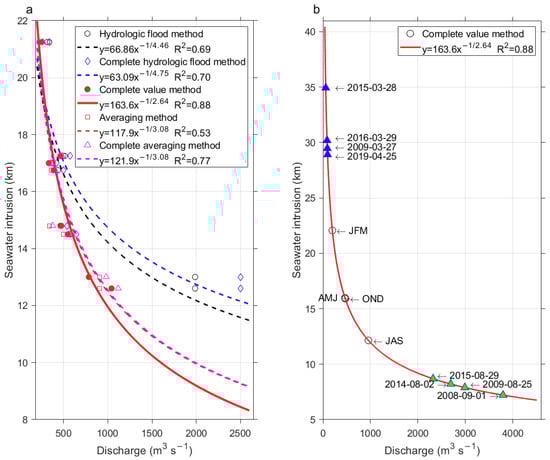(a) Regression curves between the different measures of discharge(s) from the river(s) and saline water intrusions (average of ebb and flood type) in the VRE for the four seasons of the year under conditions of spring and neap tides applying power regression models. (b) The power regression curve that was obtained between the complete value method discharges and saltwater intrusions with a R2 score of 0.88 extended to a discharge range of 0–4500 m3 s−1. Long-term (2008–2019) seasonal averages of river discharges for January–March (JFM), austral summer, April–June (AMJ), austral autumn, July–September (JAS), austral winter, and October–December (OND), austral spring, are shown as circles. Extreme flow values are shown as triangles (minimums in blue and maximums in green).
