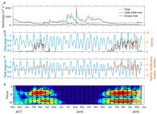 Daily time series from November 2017 to May 2019. (a) Discharges of the rivers Calle-Calle (blue line), Cruces (black line), and the sum of both rivers (red line); (b) mean daily tidal range (blue line), bottom salinity (3 m, black line), and surface salinity (red line) at the Lido station; (c) mean daily tidal range (blue line) and salinity stratification (bottom–surface, red line) at the Lido station; and (d) cross wavelet transformation between bottom salinity and tidal range at the Lido station. Common power, blue = low, red = high; the arrows pointing to the right indicate that both time series were in phase and vice versa; the 5% significance level against red noise is shown as a thick contour. In (a) the dotted black line shows the value of 280 m3 s−1.