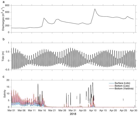 Hourly time series during March and April 2018. (a) Sum of the daily flows of the Calle-Calle and Cruces rivers; (b) reconstruction of the hourly astronomical tide at the Lido station; and (c) bottom (3 m, red line) and surface (blue line) hourly salinity at Lido, and bottom (8 m, black line) hourly salinity at Valdivia.