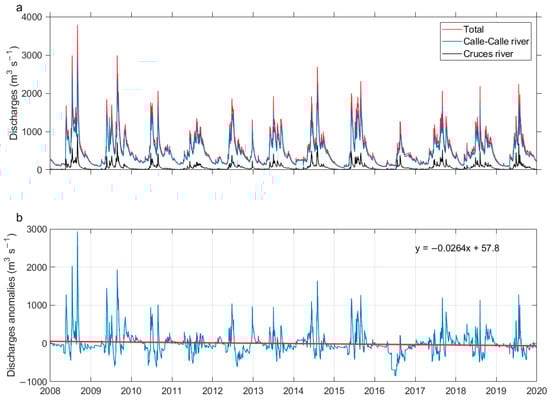 Time series of daily (a) river flow of the Calle-Calle (blue line) and Cruces (black line) rivers and sum of both rivers (red line) and (b) discharge anomalies of the sum of the Calle-Calle and Cruces rivers. The red line in (b) represents the linear trend from 2008 to 2019 and its mathematical representation is shown in the upper right corner. The flow data anomalies were based on the long-term daily means: 2008 and 2019.