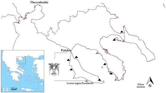 The Thermaikos Gulf is in the north-western Aegean Sea (Figure 1). It is the largest gulf (covering and area of about 5100 km2) and is one of the most productive parts of the eastern Mediterranean basin [36] that supports the most important fishing activity in Hellenic waters [37]. The oceanographic characteristics of the Thermaikos Gulf demonstrate seasonality. The significant forces that form its ecological status are the water exchanges from/to the Aegean Sea and the riverine fluxes of freshwater from several rivers [38]. The Thermaikos Gulf has little depth variation and it is dominated by soft sediments. These have an impact on the resuspension generally [39] and are several times higher in comparison to the contribution from the major rivers in the area [39]. The gulf receives approximately 120,000 m3 day−1 of sewage from the city of Thessaloniki and 25,000 m3 day−1 of industrial discharge [40]. The caramote prawn Penaeus kerathurus (Forskål, 1775) and the pink shrimp Parapenaeus longirostris (Lucas, 1846) are the two main decapod species that are believed to be exploited in the Thermaikos Gulf [41]. Furthermore, the invasive blue crab Callinectes sapidus (Rathbun, 1896) is fished and some quantities are, mainly, exported [42].