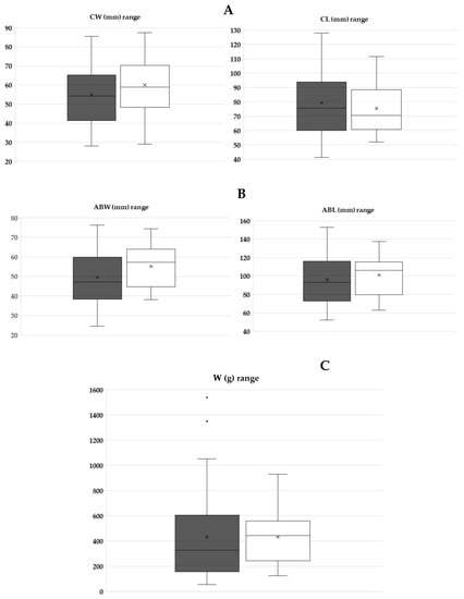 The maximum, average, and minimum values of all obtained measurements (i.e., CL, CW, ABL, ABW, and W) from the sampling procedure are presented as box plots, since these diagrams offer better clarity (Figure 2)—please see Table A1, Table A2 and Table A3 at the Appendix A for further details.