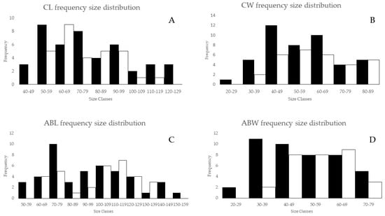 Frequency size distribution of male (black) and female (white) spiny lobsters. (A) CL distribution; (B) CW distribution; (C) ABL distribution; (D) ABW distribution.