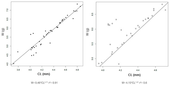 Relationship between carapace length (CL) and weight (W) of the male (left) and female (right) spiny lobsters Panilurus elephas from the Thermaikos Gulf. The linear regression was performed and plotted with R. Data presented after log-transformation.