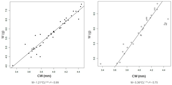 Relationship between carapace width (CW) and weight (W) of the male (left) and female (right) spiny lobsters Panilurus elephas from the Thermaikos Gulf. The linear regression was performed and plotted with R. Data presented after log-transformation.