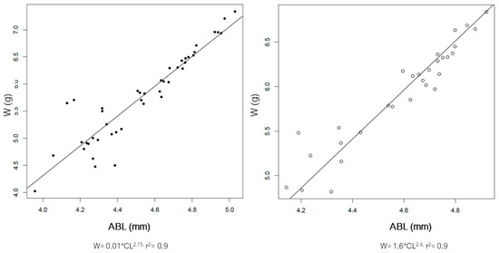 Relationship between abdominal length (ABL) and weight (W) of the male (left) and female (right) spiny lobsters Panilurus elephas from the Thermaikos Gulf. The linear regression was performed and plotted with R. Data presented after log-transformation.