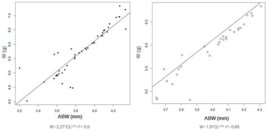 Relationship between abdominal width (ABW) and weight (W) of the male (left) and female (right) spiny lobsters Panilurus elephas from the Thermaikos Gulf. The linear regression was performed and plotted with R. Data presented after log-transformation.