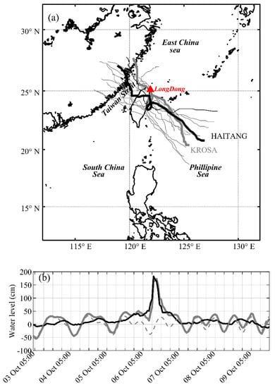 (a) Tracks of selected historical typhoons (2005–2014) and location of Longdong station; (b) total water level, astronomical tide, and storm surge deviation at Longdong during Typhoon Krosa.