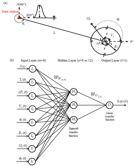By contrast, this study focuses on characteristics of a typhoon, i.e., the effective controlling parameters. In addition to storm surge (S), central pressure deficit (∆Pc), and maximum wind speed (Vc), we consider the location of a typhoon by its distance (L) and relative angle (θc) rather than the longitude and latitude. Particularly, the relative angle of a typhoon (measured counterclockwise with 0 degree from the east) can imply the favorable wind direction (e.g., θw ≅ θc + 115°) near a tidal station which is an important factor for storm surge prediction. Note that only the relative angle is needed here since a linear shift between θw and θc causes no difference for the artificial neural network model. The radius of typhoon (R7) that reflects the affected area with wind speed over 15 m/s is also taken into account. Furthermore, the forward speed (UF) and direction (θF) are adopted to provide the information on possible impacts of a typhoon. Although high uncertainty exists in typhoon tracks, these dynamic factors estimated by the center locations between two successive observations would improve long-lead-time (12 h) surge predictions especially for mildly varied typhoons. Here, we also point out that the so-called invasion angle, i.e., the difference between typhoon moving direction and the line from tidal station to typhoon center, was used in Tseng et al. [62]. When a typhoon from any direction passes exactly through the tidal station, however, the resulting influences cannot be correctly described by the definition used in previous work (i.e., due to a value of zero for that angle). Overall, this study employs a total of eight effective controlling parameters to predict storm surge (see the depicted diagram in Figure 2a). Also, a series of combinations among these effective controlling parameters (see Table 2) is considered to examine their roles and contributions. Note that the values of effective typhoon parameters are fully based on the real observation. Although they can also be obtained from numerical weather predictions, accuracy and uncertainty of atmospheric models would be another critical issue. The geographical parameter is not considered here. However, the effects of coastal topography/geometry on surge level at a specific site can be implicitly included in the artificial neural network model. For various tidal stations, a general (or universal) approach for ANN models will be further investigated in the future.