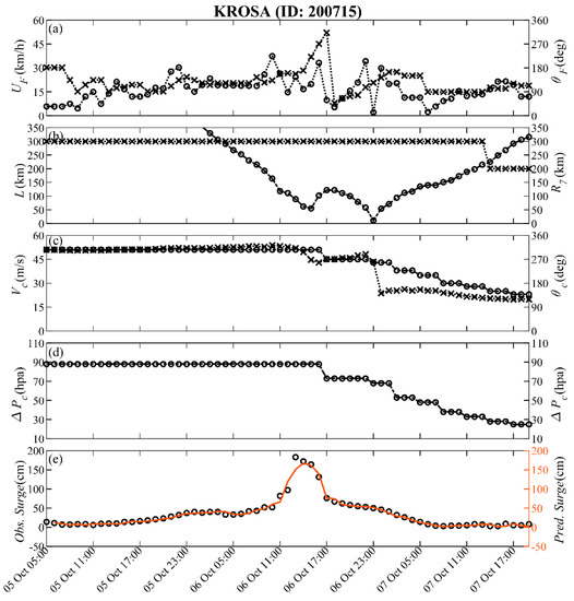 Temporal variations of typhoon parameters and storm surge at Longdong during Krosa event (training): (a) forward speed (circle) and forward angle (cross); (b) relative distance (circle) and radius of typhoon (cross); (c) wind speed (circle) and relative angle (cross); (d) central pressure deficit (circle); (e) observed (circle) and predicted (red lines) storm surges.