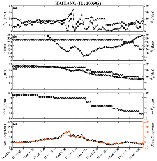 Temporal variations of typhoon parameters and storm surge at Longdong during Haitang event (validation): (a) forward speed (circle) and forward angle (cross); (b) relative distance (circle) and radius of typhoon (cross); (c) wind speed (circle) and relative angle (cross); (d) central pressure deficit (circle); (e) observed (circle) and predicted (red lines) storm surges.