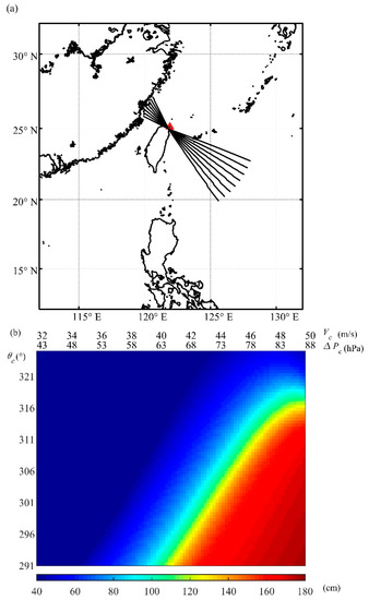 We further extract knowledge from the artificial neural network (i.e., maximum storm surges under various conditions) using a series of synthetic typhoons. Based upon the historical data, the central pressure deficit considered in this study ranges from 43 to 88 hpa. The maximum wind speed from 32 to 50 m/s is determined by an empirical regression V = 2.692 (ΔP)0.654. The radius of typhoon is 250 km for all cases. The initial location is at a distance of 648 km southeastern of Longdong with a relative angle from 292° to 325°. Then, the typhoon moves along a straight line with a forward speed of 18 km/h when approaching Taiwan (see Figure 6a for the paths). After a period of 36 h, the typhoon finally makes landfall in Ilan, which is located approximately 15 km south of the station.