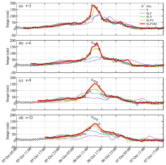 Long-lead-time storm surge predictions obtained by different combinations of controlling parameters for Krosa event (training): (a) t + 3; (b) t + 6; (c) t + 9; (d) t + 12.
