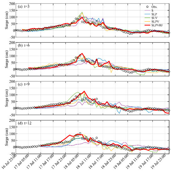 Long-lead-time storm surge predictions obtained by different combinations of controlling parameters for Haitang event (validation): (a) t + 3; (b) t + 6; (c) t + 9; (d) t + 12.