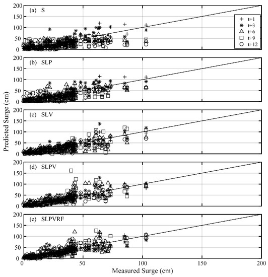 Scatter plots of predicted and measured storm surges for all validation events under different input combinations (from top to bottom panels) and lead-time (various symbols): (a) S, (b) SLP, (c) SLV, (d) SLPV, and (e) SLPVRF.