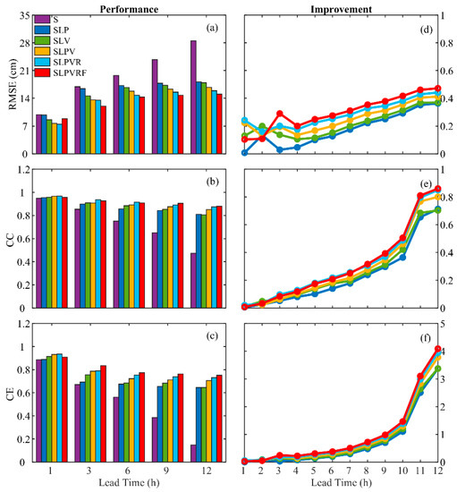 Prediction capability and performance improvement in terms of (a,d) RMSE; (b,e) CC; and (c,f) CE for all the validation events.