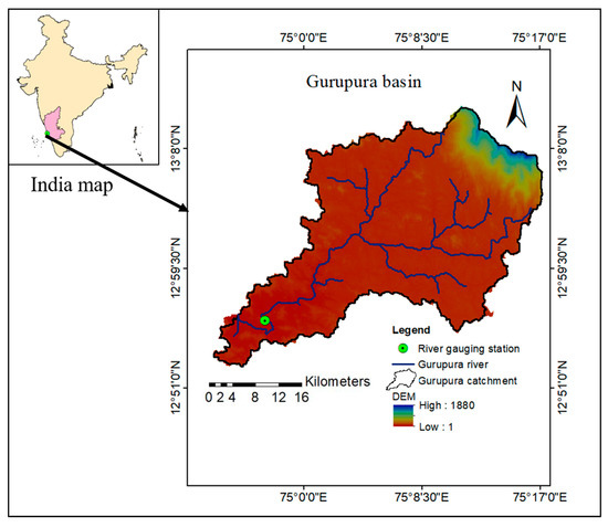 The Western Ghats (WG) are the mountain ranges along the west coast of India that extend for about 2300 km parallel to the seacoast. They are located at a distance of about 100 to 200 km from the seacoast across the Gujarat, Maharashtra, Karnataka, and Kerala states of India [33]. The Gurupura river is one of the west-flowing rivers originating in the WG of India, at an elevation of 1880 m above mean sea level. The catchment has two river gauging stations at Addoor and Polali, which are maintained by the Central Water Commission, Government of India and the Public Works Department of the Government of Karnataka [34], respectively. For the present investigation, the Addoor gauging station was selected, which drains out an area of about 840 km2 (Figure 1). The west coast consists of a coastal plain with agricultural cropland followed by the lateritic plateau dominating the central portion of the river basin and dense forest in the hilly regions of the Western Ghats. The mean annual precipitation over the basin is about 3812 mm, mostly occurring during the southwest monsoon season (June to September). It is characterised by a humid and tropical climate with a temperature range of 20 to 35 °C. It is one of the vital river basins within the WG, which supplies drinking water to the suburban region of Mangalore city and a few industrial units and agricultural activities in the basin.