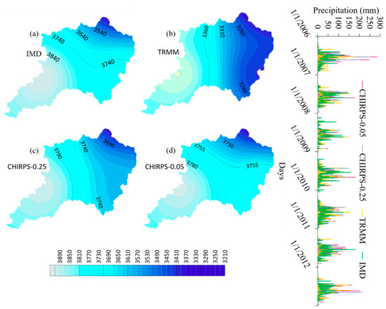 Figure 3 represents the isohyetal maps for IMD, TRMM, CHIRPS-0.25, and CHIRPS-0.05 and time series of daily rainfall data. The spatial distribution of annual average rainfall portrays interesting characteristics of rainfall intensity in the windward side of the Western Ghats.