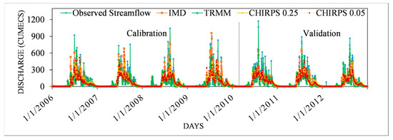The daily simulation of streamflow using the four datasets is represented in Figure 4. It is noticed that the IMD gridded data, which were derived from the observed gauged data, are the best at simulating the observed flow compared with other datasets. At the daily time scale, the TRMM underestimates the low flow, whereas it tries to match with the peak flow. This may be mainly because of orographic precipitation during the monsoon season resulting due to the Western Ghats mountainous region in the study area. The orographic lifting of moist air leads to cloud formation, and even when the cloud top is relatively warm, rainfall will occur. The deep convection of this cloud system is due to latent heat release. The infrared satellite sensors may not detect precipitation from warm clouds and may lose the capture of ice loft, thereby detecting only a portion of rain from deep convection [6,11,34,60]. This process may be the reason for the lower performance of the satellite data-driven model than the IMD data-driven model. Even though the spatial resolution of both CHIRPS datasets (0.25° and 0.05°) is different, it was found that the finer resolution does not make much improvement in the flow simulation.