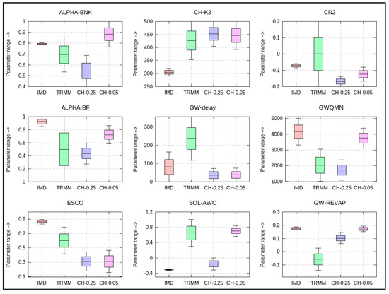 The hydrological models reproduced streamflow by adjusting relevant model parameters and converged to different optimal intervals of calibrated parameters [17]. The distribution of the range of the most sensitive parameters for the four rainfall datasets is illustrated in Figure 5. Typically, the most sensitive parameter in the streamflow simulation was curve number CN2 [46]. A different set of rainfall data produced different ranges of parameter values. Among these, the most apparent difference was seen in the TRMM range of values. A wide range of values was obtained using TRMM for each iteration, whereas IMD fell within a very short range. Groundwater parameters such as GW-DELAY, GW-REVAP, GWQMN, and ALPHA-BF also portrayed different ranges of values for different datasets. However, it was not possible to find a typical range of values since the models tried to merge with the observed value. The channel parameters, such as CH-K2 and ALPHA-BNK, also exhibited different patterns. In brief, it could be inferred that no consistent pattern exists to correlate the parameter ranges and their uncertainty for the precipitation products used in this study. Additionally, it is not possible to determine which dataset will have higher uncertainty for the parameters. A similar approach of study and results were analysed by [17], and the variability in the estimated parameter was basin-specific.