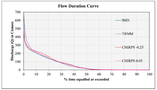 The FDCs are the tools used for hydrological behaviour interpretation [55]. The FDCs are used to systematically explain the frequency of high flows and low flows in the stream, and to determine the probability of exceedance during the study duration. This provides both analytical and graphical information to understand flow variability in the past and future. The SWAT model was run for all four precipitation datasets, viz., IMD, TRMM, CHIRPS-0.25, and CHIRPS-0.05. Exceedance flow analysis, performed by fitting an empirical equation [56] to the simulated flows at 5%, 10%, 25%, 50%, and 70%, is identified. Q5 is the flow that exceeds 5% of the period of analysis, and Q10 is the flow that exceeds 10% of the period of analysis, and so on. The flows corresponding to 5% and 10% are indicative of the extreme flood events, 50% dependability indicates the median flow, 70% dependable flow corresponds to the water availability for agriculture, and higher dependable flows correspond the water availability for domestic requirements [57]. Since the study catchment experiences very high flow during the monsoon season and negligible flows over the rest of the year, spatial variations of above 30 percentile flow for the catchment are attempted. The simulated outflows obtained from the SWAT model were further analysed to identify spatial heterogeneity at the subbasin scale for the events and availability of water in the basin. The flow duration curve (FDC), a significant variability signature, is the relationship between the discharge and the percentage of time that the discharge is equalled or exceeded [28].